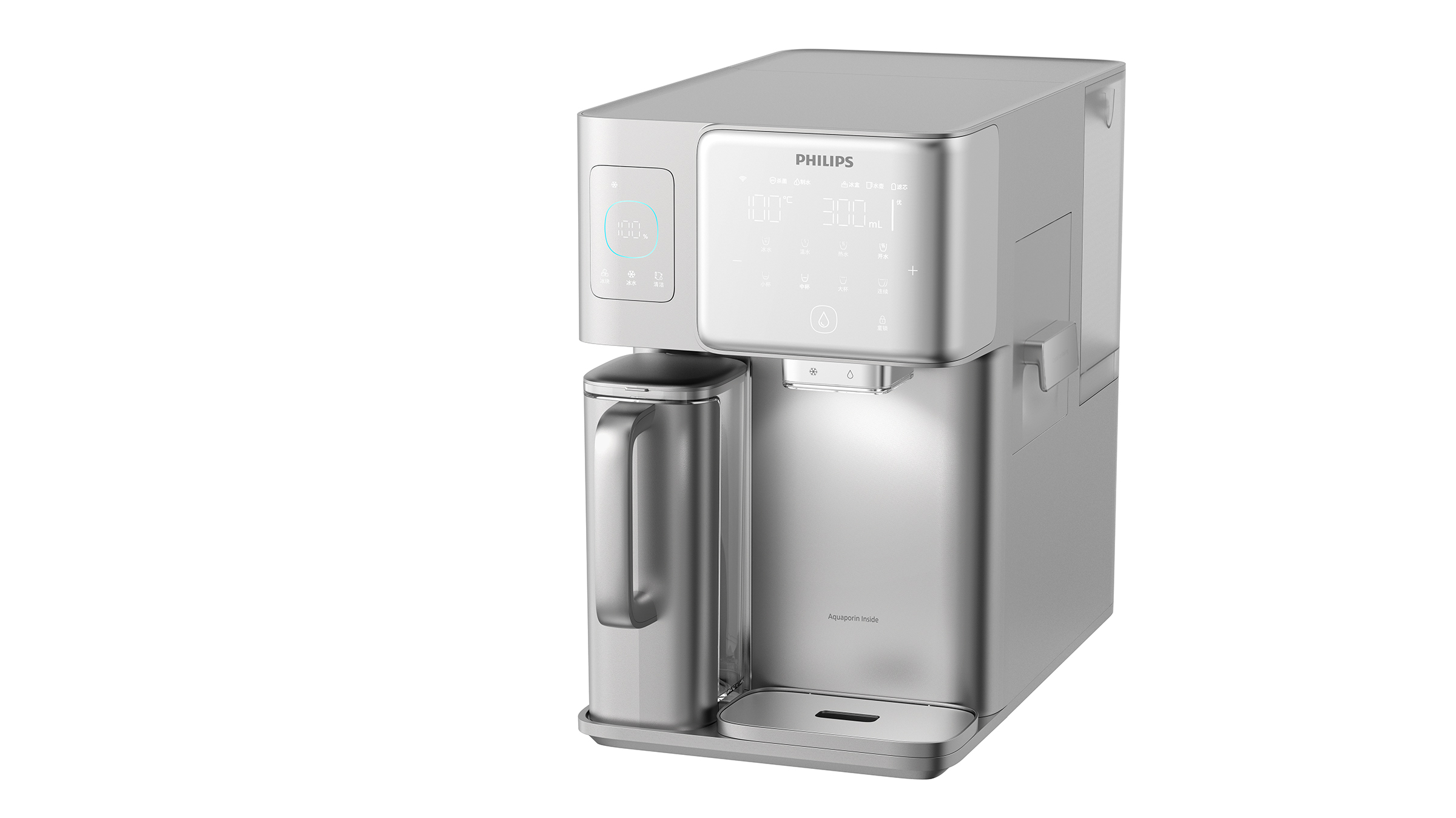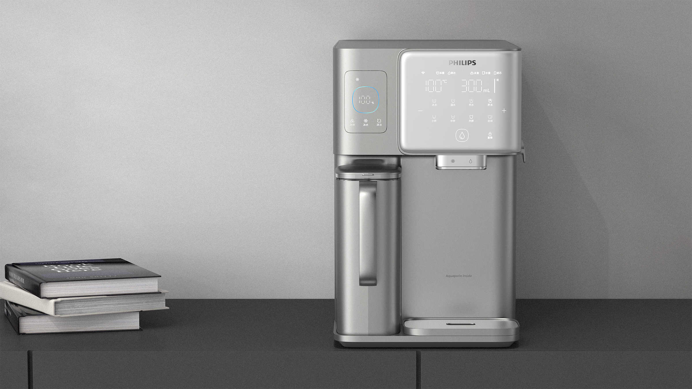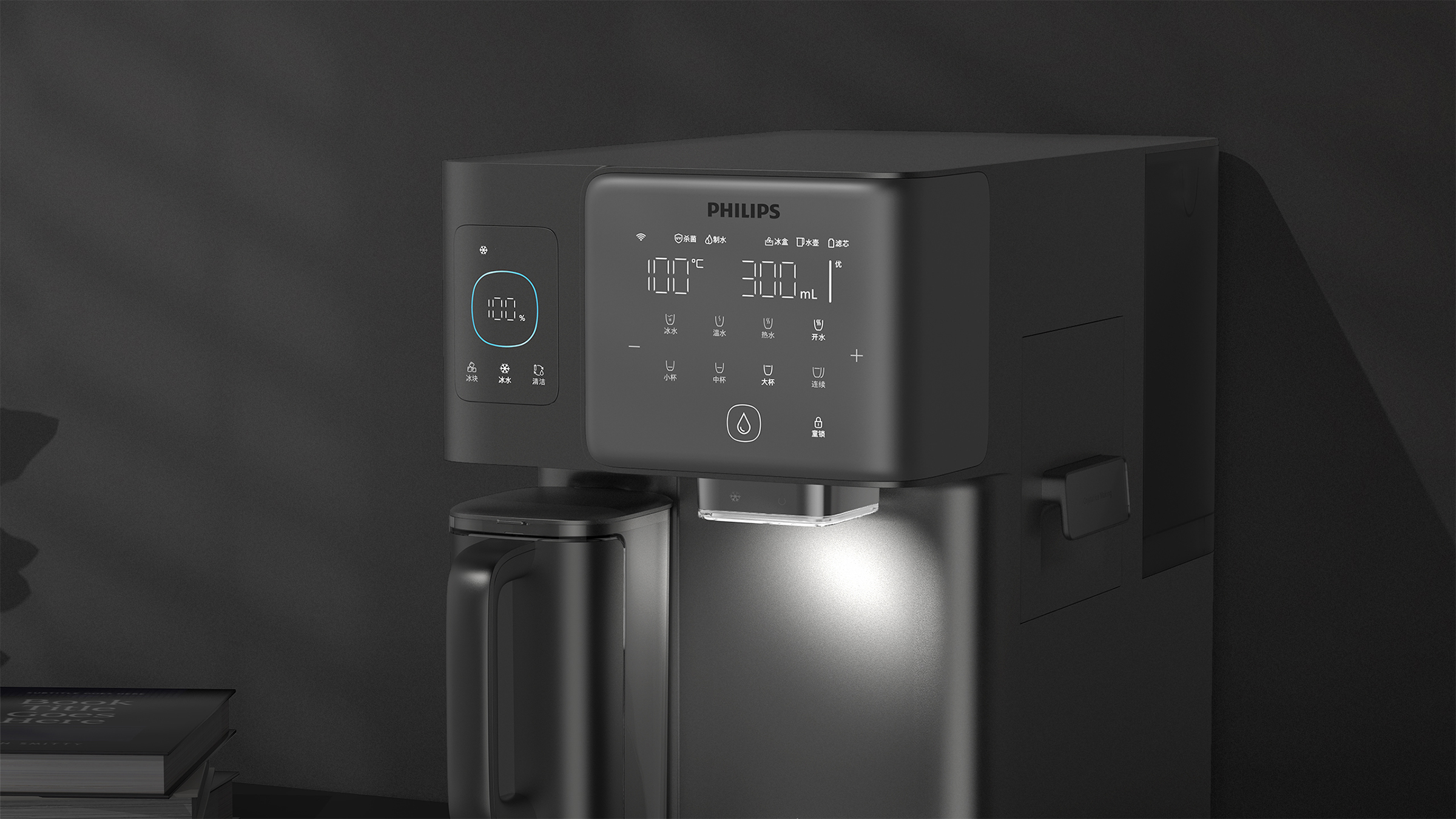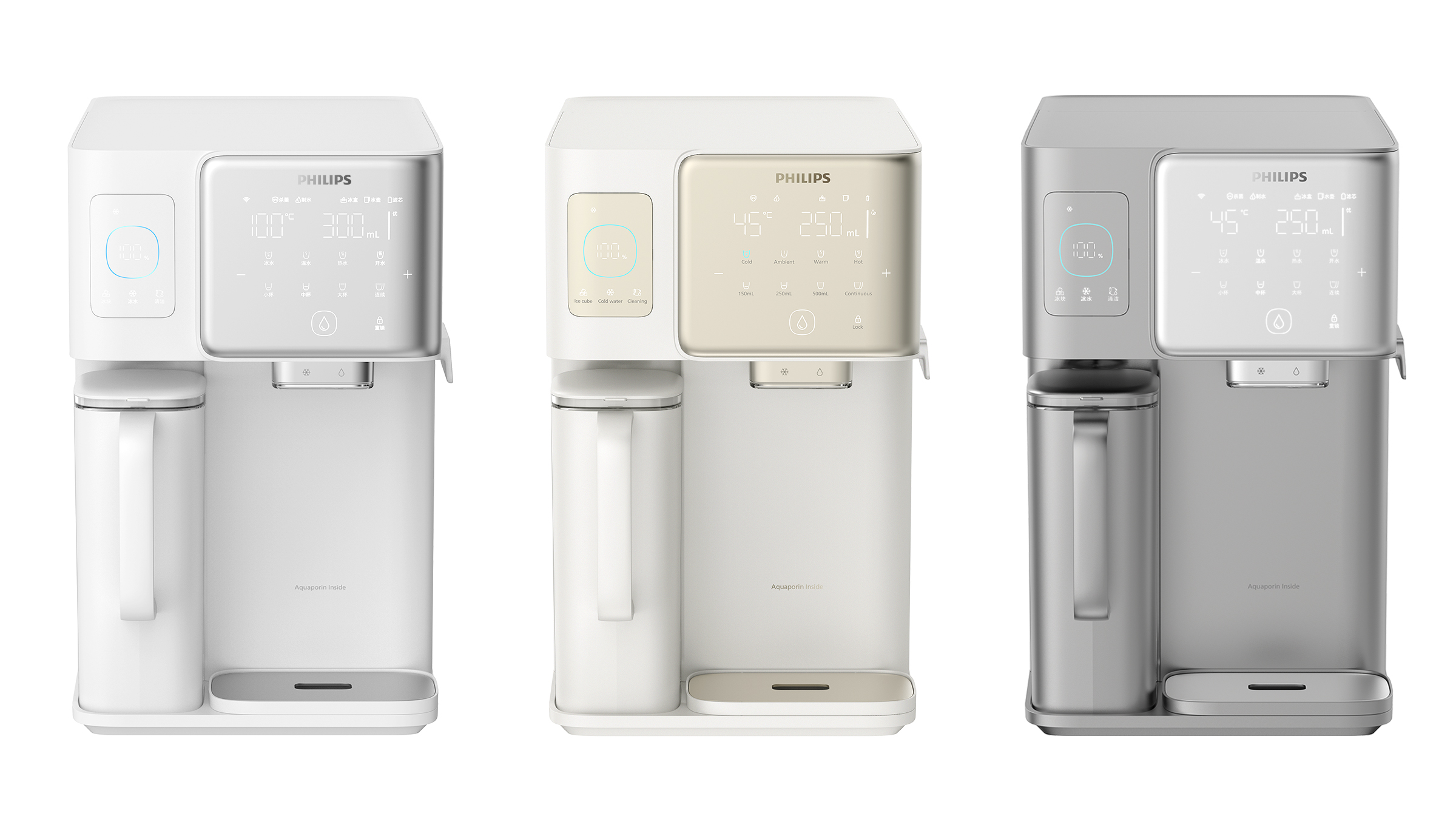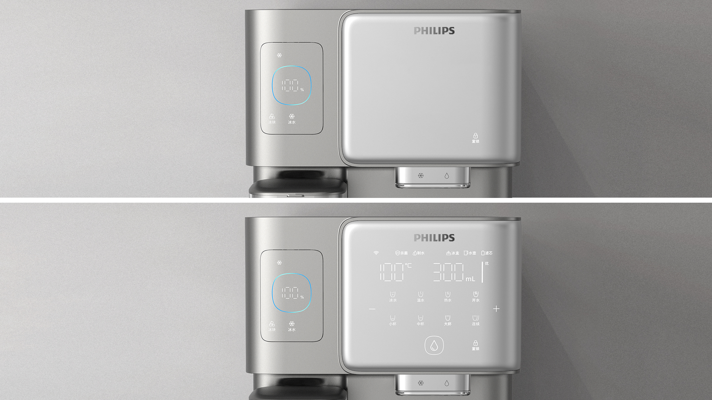 Philips Frappuccino is a desktop water dispenser that integrates ice making, instant heating and filtration functions. The smart geometric design language is designed to adapt to the warm and comfortable home style of most users. The functionally partitioned interactive interface makes use simpler and clearer. The curved panel is designed to further guide the user with an ice cube drawer on the side. Compared with the method of removing ice cubes directly from the top of the faucet, the experience of removing ice cubes from the drawer is more interesting and elegant, and it will also be quieter in certain usage scenarios.In order to ensure a simple design language, the control panel only retains some conventional function buttons.More functions are integrated in the APP, such as night mode. When the user does not want to be disturbed by the noise of the machine at night, then turning on the night mode in the APP can keep the machine running quietly.